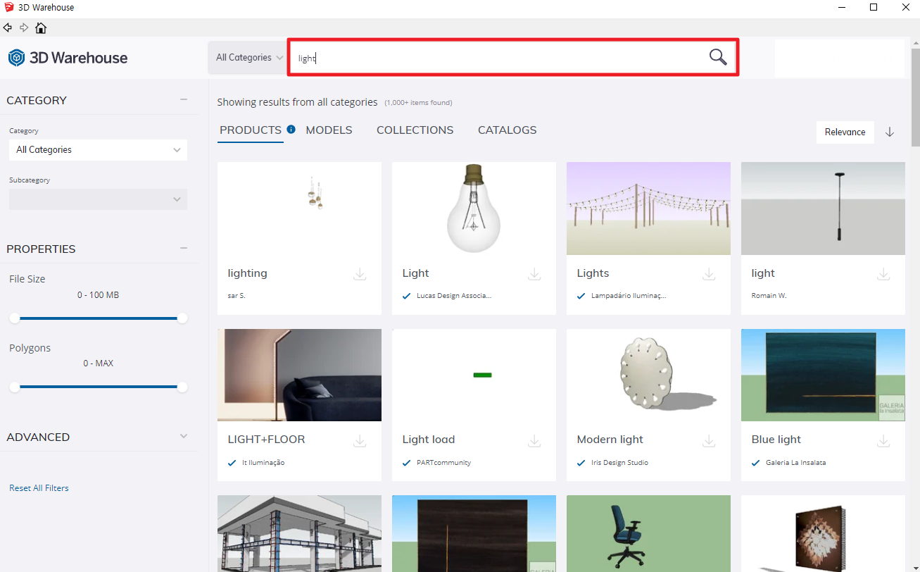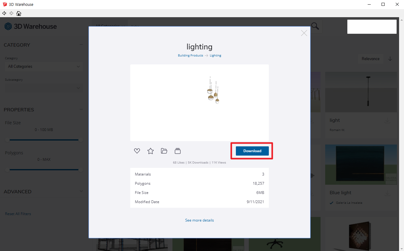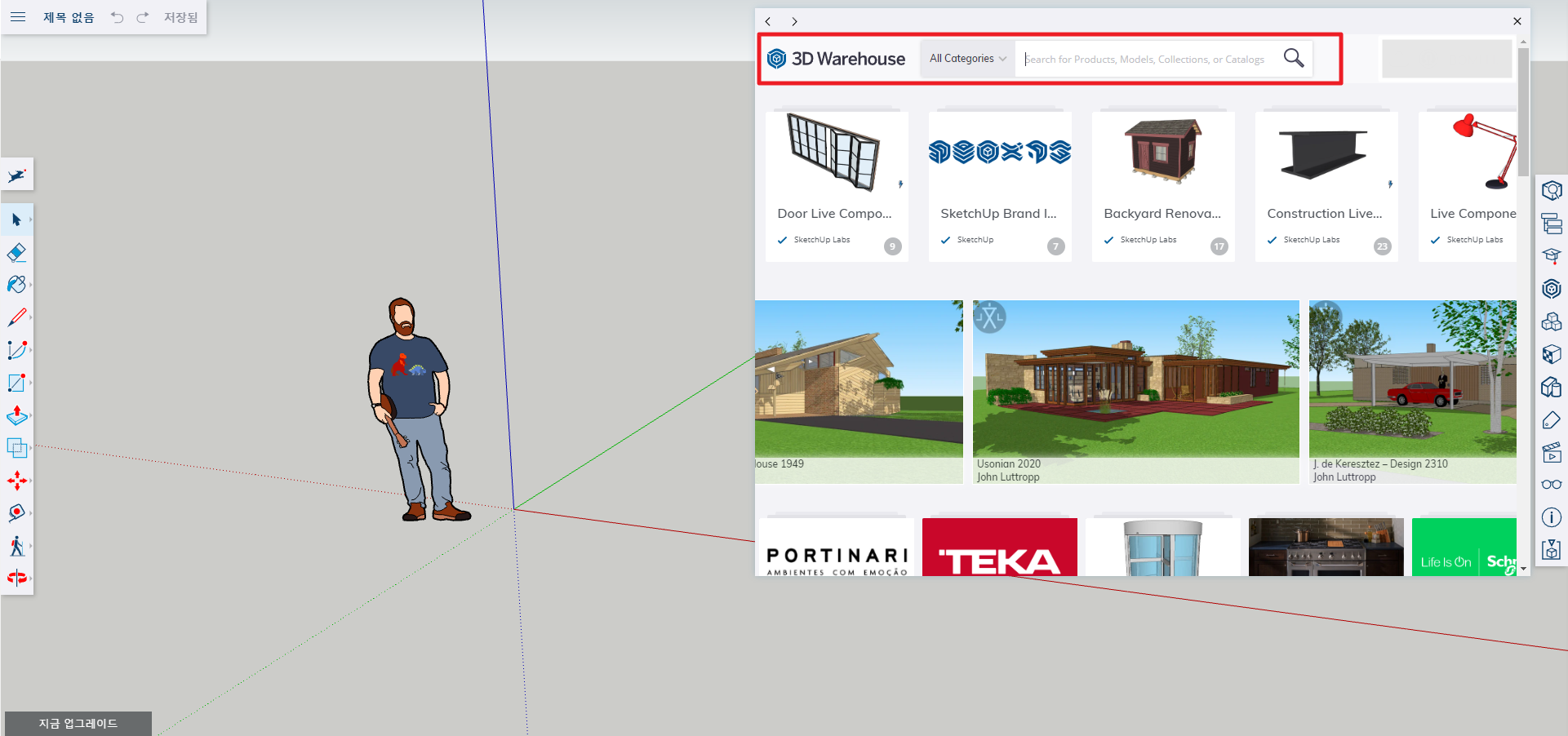 3. 3D 웨어하우스 창에서 검색 후 다운로드!