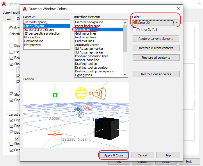 배치탭 십자선 컬러 변경: Sheet / layout - Crosshairs - Color :원하는 컬러로 변경 - Apply & Close 클릭.