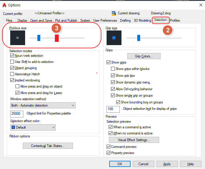 Pickbox size란에서 좌우로 이동하여 커서 크기 조절
