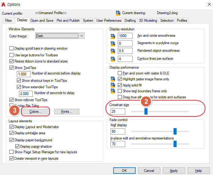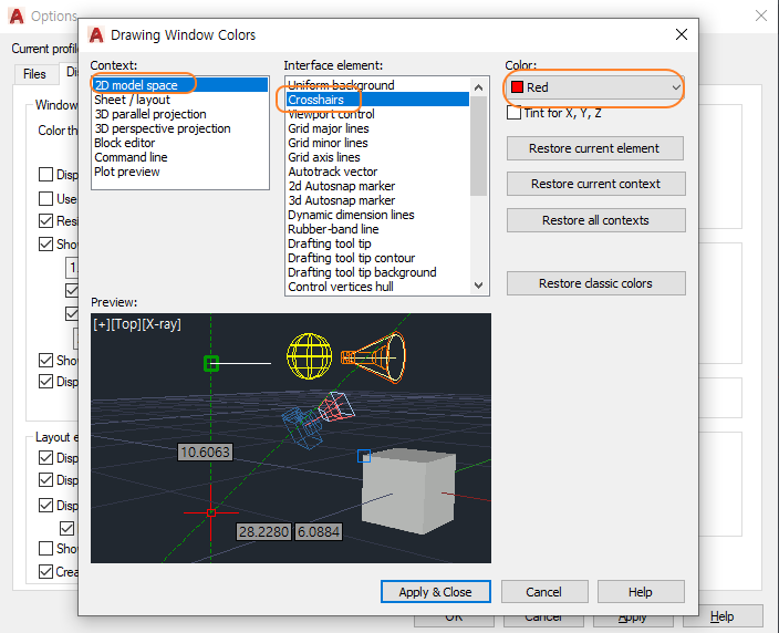 모델창 십자선 컬러 변경: 2D model space - Crosshairs - Color :원하는 컬러로 변경 - Apply & Close 클릭.